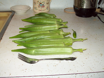 When you wait two days in Texas to pick your okra-- and it rains the day you don't! These critters were not a ONE larger than the tines two days ago. 'Course, they weren't rain-saturated either!